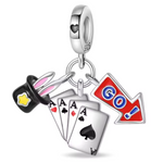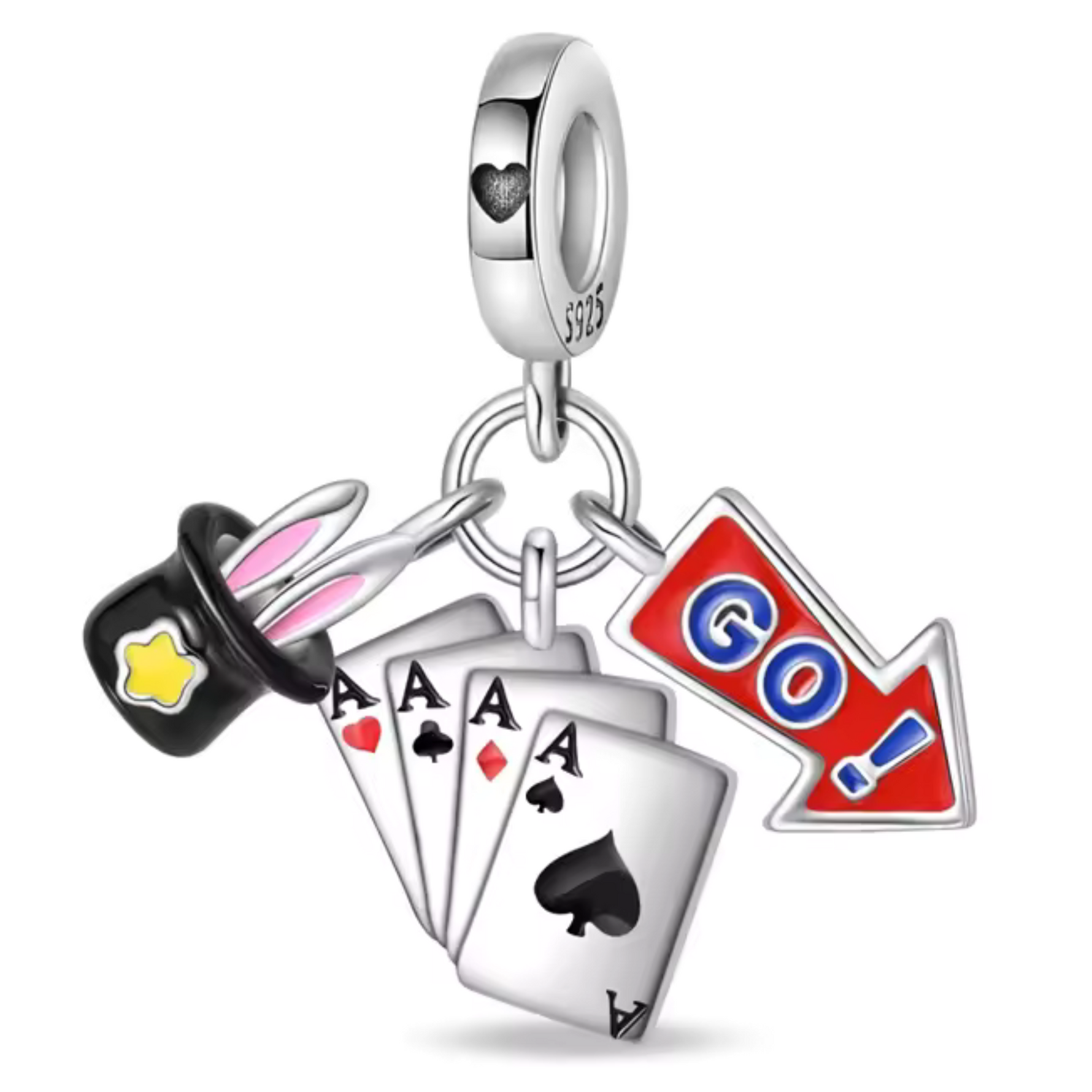 Add a touch of eerie and mystery to your bracelet with this charm inspired by the world of Alice in Wonderland. This sterling silver charm features a top hat resting on its side, with a mischievous white rabbit peeking out, straight from the tale. Playing cards fly around the hat, symbolizing Alice's wonderful and unpredictable world. A golden key dangles from one of the cards, adding a magical dimension to the whole, as if you were holding the key to a fantastical universe.