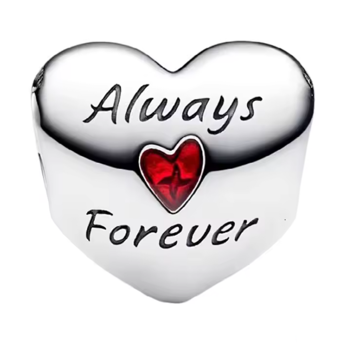Express eternal love with this 925 silver heart-shaped charm, engraved with the words "Always Forever." This piece of jewelry symbolizes unwavering love, endless commitment, and passion that endures through time. Elegantly designed, this charm adds a romantic and timeless touch to your bracelet, reminding you of the importance of love in every moment of life.