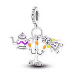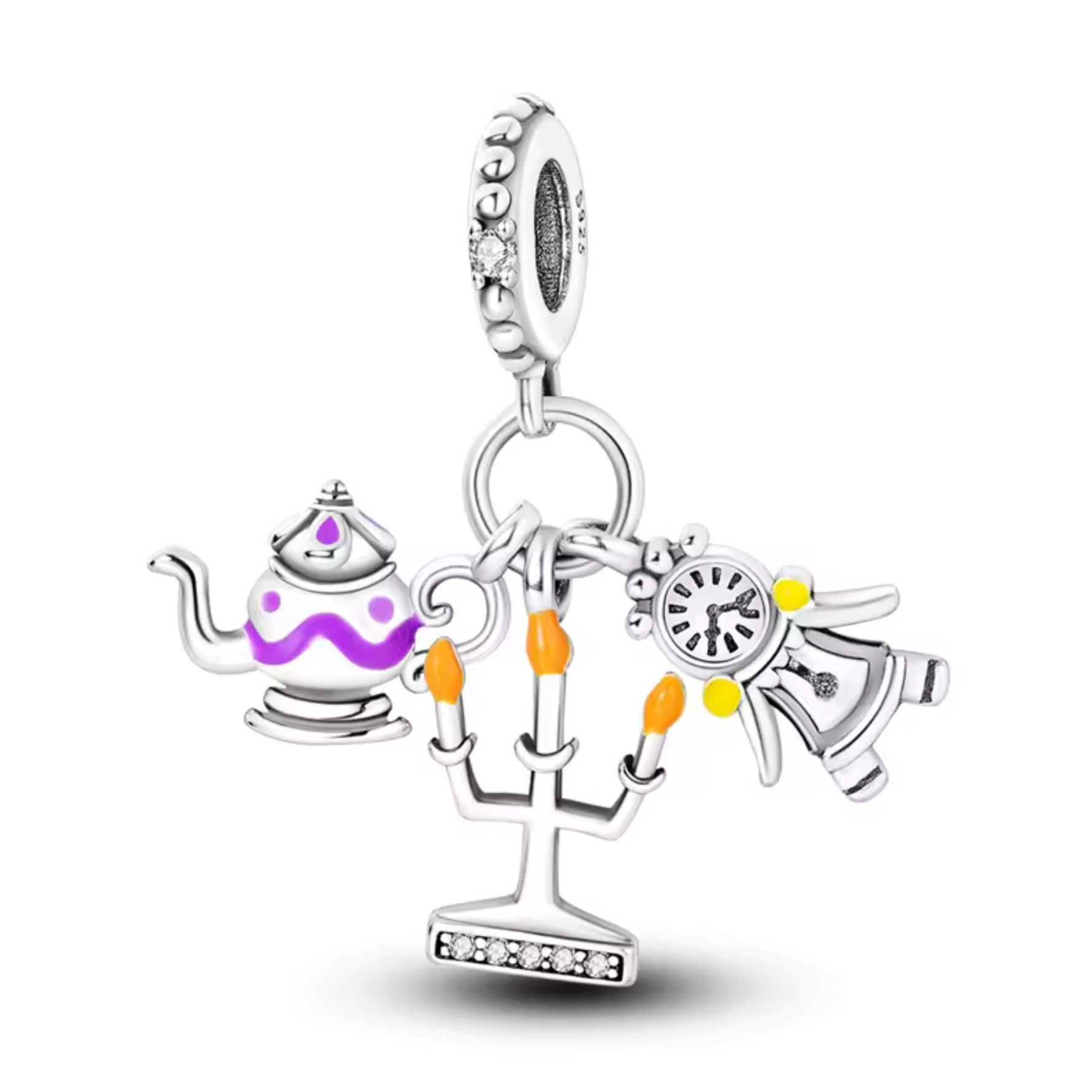 Immerse yourself in the magical world of Beauty and the Beast with this exquisite charm featuring the three beloved companions of the enchanted castle: the tender teapot, the flamboyant candlestick, and the dignified and punctual clock. Crafted in sterling silver, this piece celebrates the friendship, magic, and timeless elegance of this beloved tale.