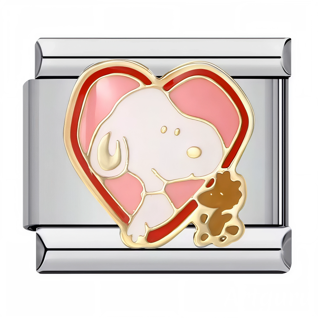 This elegant Italian charm features Snoopy nestled in a vibrant red heart, accompanied by Woodstock at his side, for a tender and friendly duo. Crafted from stainless steel with silver and gold finishes, it combines brilliance and refinement while ensuring strength and quality. Easy to attach, it fits bracelets made of 17 expandable and adjustable links, suitable for all wrist sizes. Compatible with all our Italian charms, this piece of jewelry brings a romantic and warm touch to your personalized bracelet.