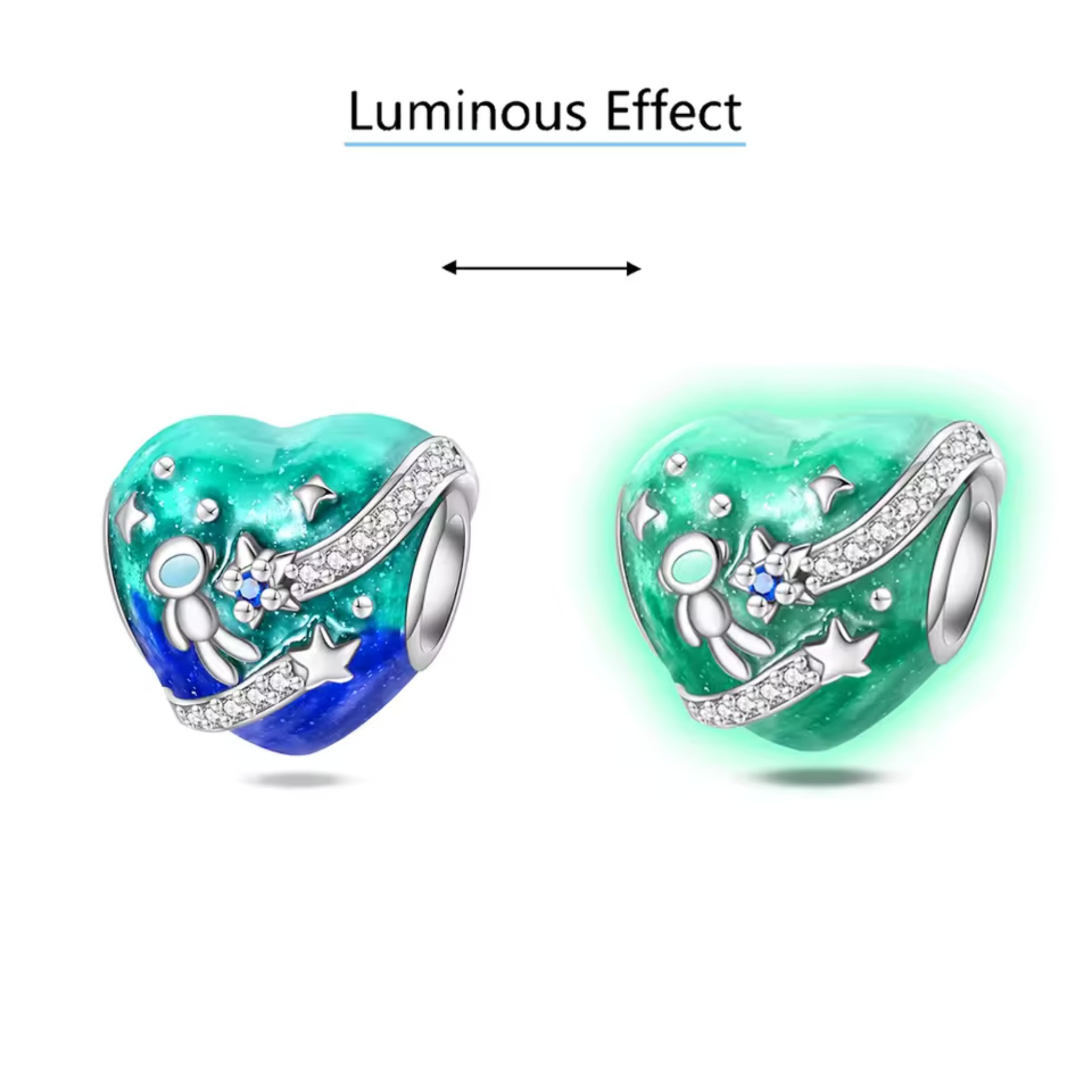 This unique charm combines the sweetness of a heart with the adventure of an astronaut floating in space. Crafted in 925 silver, it captures the light of day to delicately illuminate in the darkness thanks to its glow-in-the-dark effect. A poetic and futuristic jewel for those who love to carry their dreams... to the stars.