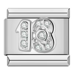 This silver Italian charm features the number 18 , adorned with sparkling rhinestones, perfect for celebrating a milestone birthday or anniversary. Crafted from high-quality stainless steel with a shiny silver finish and sparkling details, it combines strength and elegance. Easy to attach, it fits perfectly with our bracelets, which feature 17 expandable and adjustable links, making them suitable for all wrist sizes. Compatible with all our Italian charms, this piece of jewelry adds a symbolic and refined touch to your bracelet.