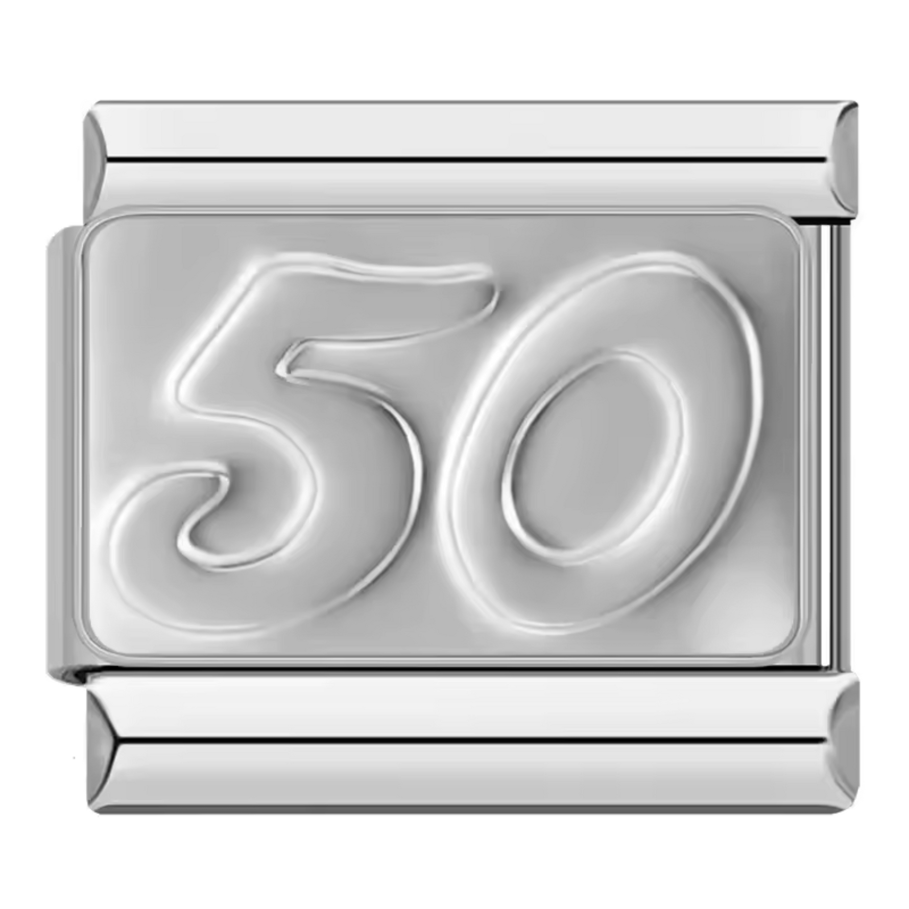 This silver Italian charm features the number 50 , a symbol of a birthday or milestone to celebrate in style. Made from high-quality stainless steel with a shiny silver finish, it combines strength with timeless style. Easy to attach, it fits perfectly with our bracelets made of 17 expandable and adjustable links, suitable for all wrist sizes. Compatible with all our Italian charms, this piece of jewelry is perfect for personalizing your bracelet with a simple and meaningful touch.