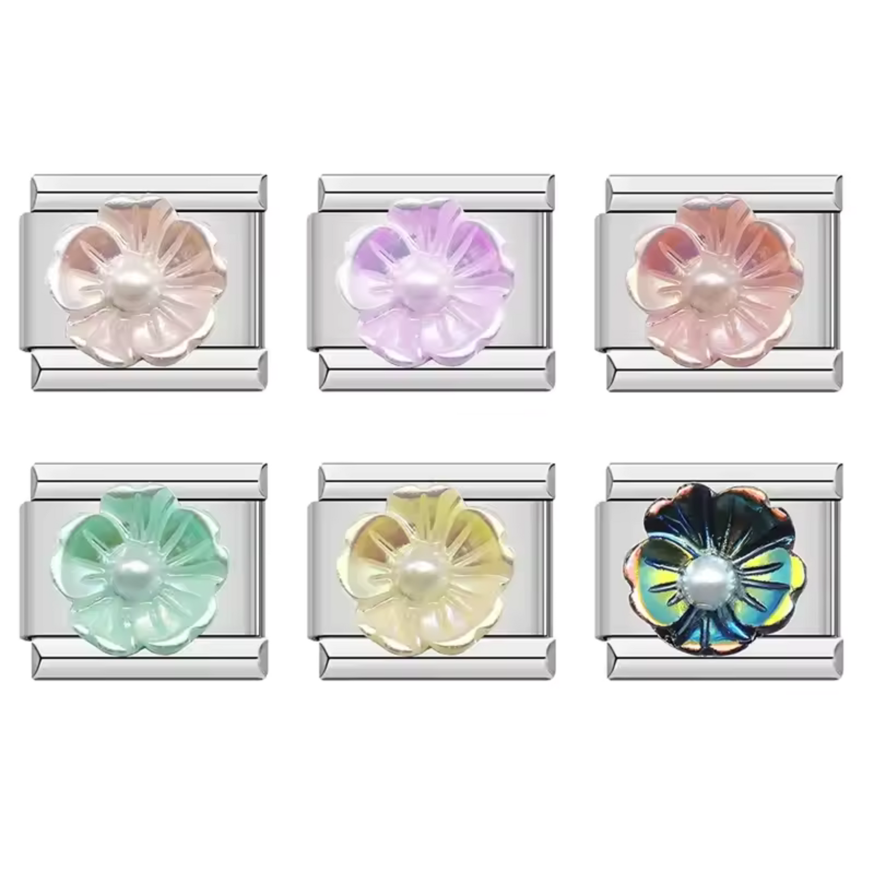 This silver-plated stainless steel Italian charm features an elegant flower, available in several colors: blue, light blue, yellow, pink, purple, and white. Both delicate and colorful, this piece of jewelry allows you to personalize your bracelet according to your style or mood. A symbol of beauty and renewal, it adds a luminous, floral touch to your composition. Easy to attach, it is compatible with all our Italian bracelets made up of 17 expandable and adjustable links. This charm perfectly matches our entire collection and will delight lovers of fine and colorful jewelry.