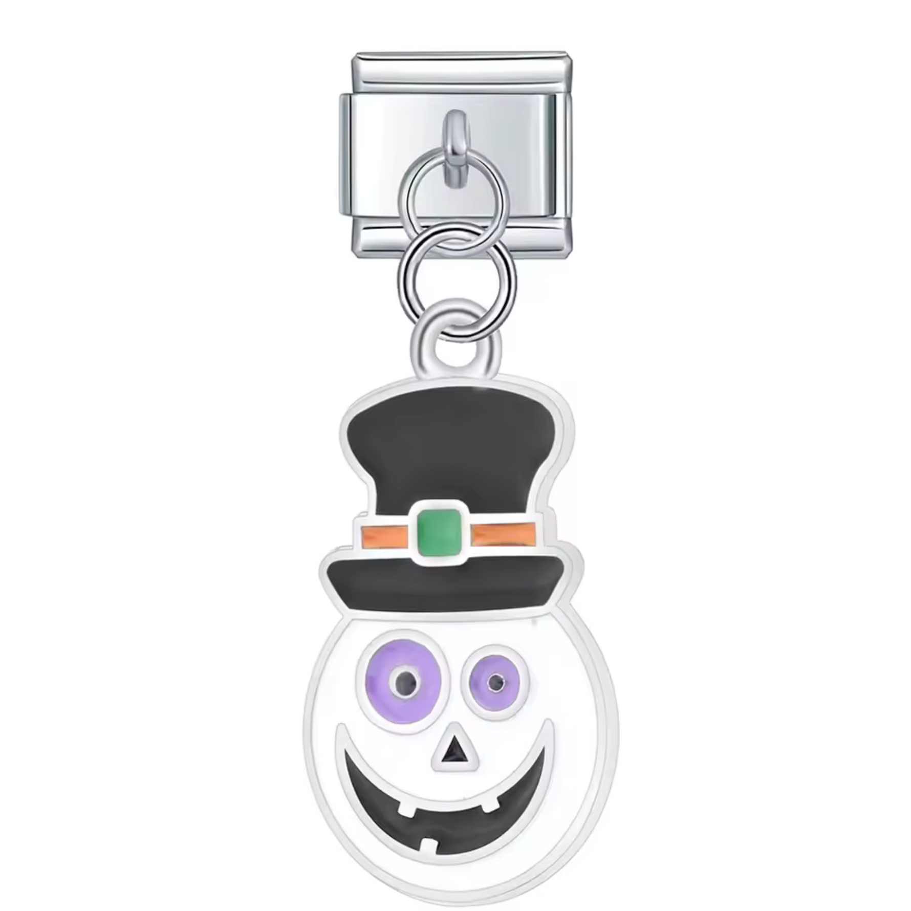 This silver Italian charm pendant features a reimagined Halloween snowman, adding festive touches and a unique look. Crafted from high-quality stainless steel with a meticulous finish, it combines strength with playful details for a unique and fun look. Easy to attach, it fits perfectly with our bracelets, which feature 17 expandable and adjustable links, making them suitable for all wrist sizes. Compatible with all our Italian charms, this pendant will add a cheerfully spooky touch to your collection.