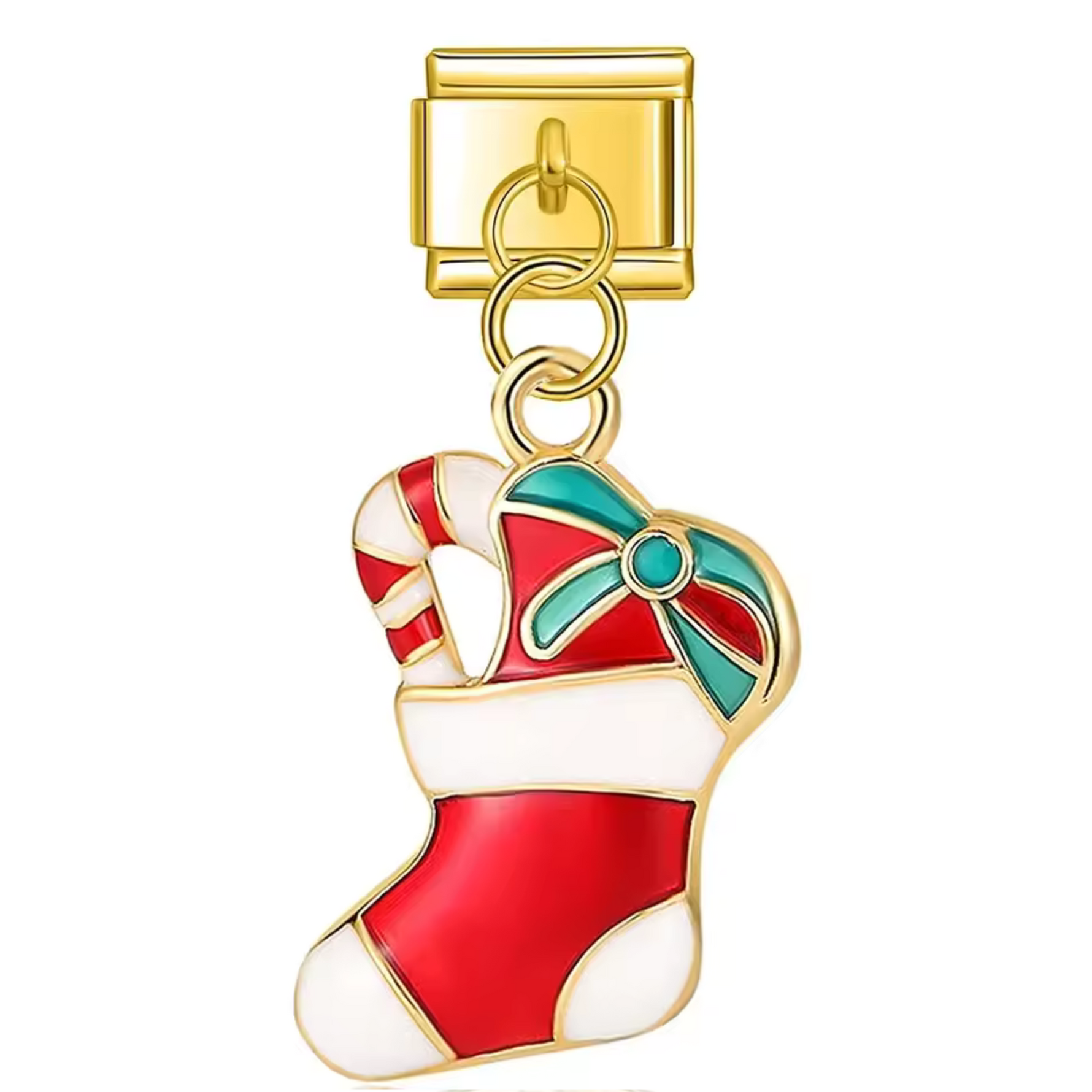 This golden Italian charm pendant features a traditional Christmas stocking, a symbol of joy and surprises during the holidays. Crafted from high-quality stainless steel with a shiny gold finish, it combines strength with festive elegance. Easy to attach, it fits perfectly with our bracelets, which feature 17 expandable and adjustable links, making them suitable for all wrist sizes. Compatible with all our Italian charms, this piece of jewelry adds a warm and welcoming touch to your bracelet to celebrate Christmas in style.