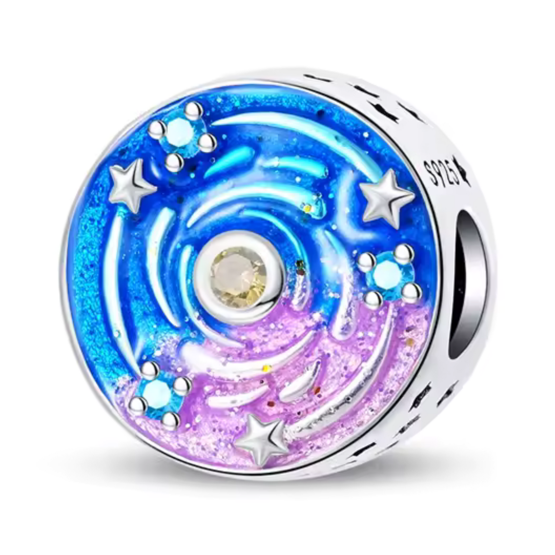 Verleihen Sie Ihrem Armband mit diesem Anhänger aus 925er Silber einen Hauch von Magie und Geheimnis. Er ist mit einem bezaubernden Farbverlauf aus Blau und Lila verziert und wird von zarten Sternen erleuchtet. Als Symbol für Träume, Unendlichkeit und Führung erinnert dieses Juwel an die Schönheit des Nachthimmels und die Magie der funkelnden Sterne.