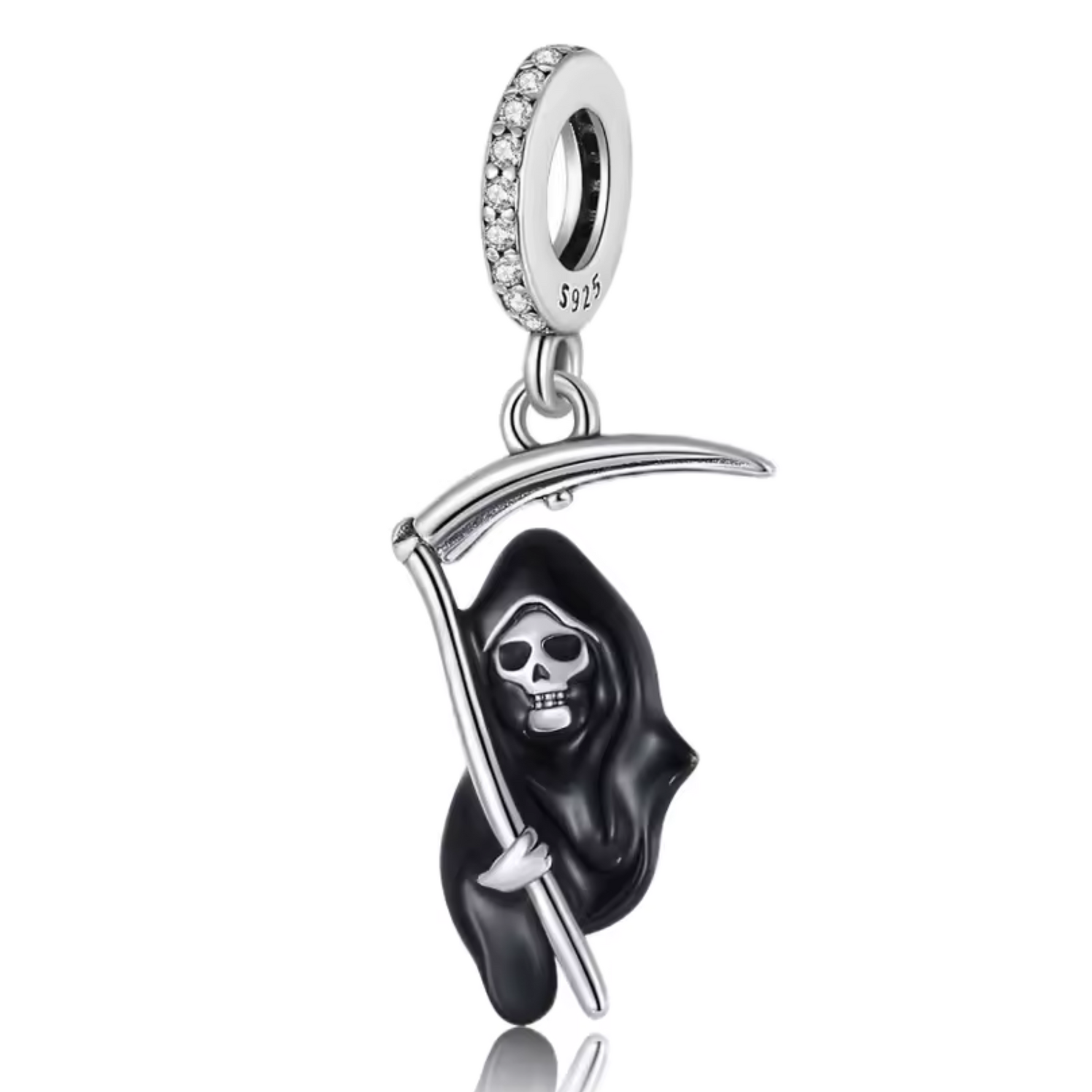 Verleihen Sie Ihrer Sammlung mit diesem Anhänger, der den Sensenmann darstellt, ein zeitloses Symbol für Schicksal und Tod, eine dunkle und mysteriöse Note. Dieser aus 925er Sterlingsilber gefertigte Anhänger fängt die unheimlichen Details der vermummten Gestalt ein, die in einer gebieterischen und rätselhaften Pose ihre ikonische Sense hält.