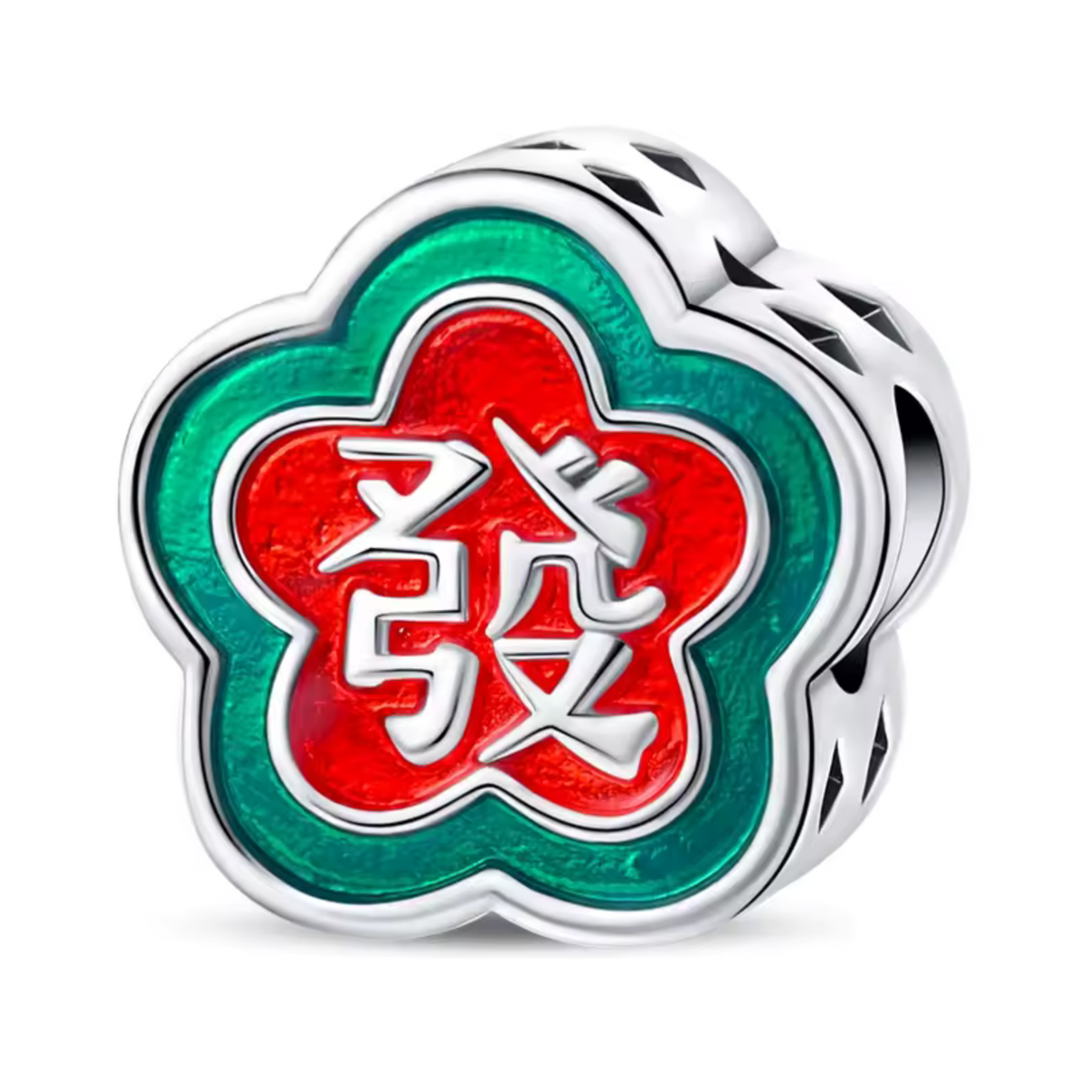 Verleihen Sie Ihrem Armband einen Hauch von Farbe und Tradition mit dem Glücks-Emaille-Blumenanhänger aus 925er Silber. Inspiriert von kulturellen Symbolen für Wohlstand und Fülle ist dieser blumenförmige Anhänger mit leuchtend roter und grüner Emaille verziert und mit chinesischen Schriftzeichen verziert, die Glück und Freude symbolisieren.