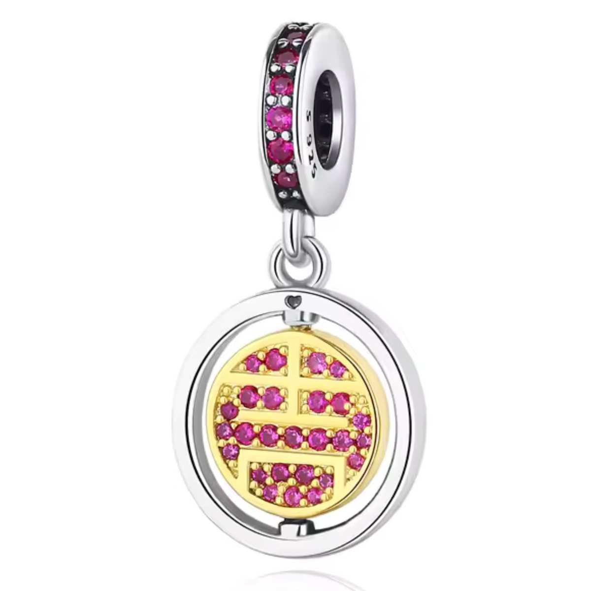 Feiern Sie den Reichtum der Traditionen mit diesem silbernen und goldenen Charm , inspiriert vom chinesischen Neujahr . Dieses Schmuckstück ist mit schimmernden rosa Steinen und einem traditionellen Goldsymbol in der Mitte verziert und steht für Glück, Wohlstand und Neuanfang. Der Ring ist außerdem mit rosa Steinen verziert, die ihm ein funkelndes und edles Finish verleihen.
