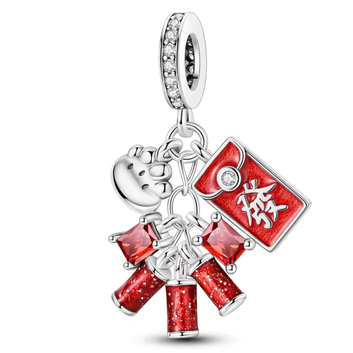 Feiern Sie die Magie und den Wohlstand des chinesischen Neujahrs mit diesem außergewöhnlichen Charm! Dieses exquisite Schmuckstück kombiniert leuchtend rote Elemente und silberne Details und stellt traditionelle Symbole wie glückbringende rote Umschläge, glitzernde Feuerwerkskörper und elegante Ornamente dar. Perfekt, um Ihrem Armband eine festliche und kulturelle Note zu verleihen.