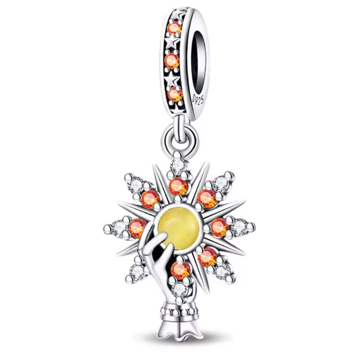 Verschönern Sie Ihr Armband mit diesem Anhänger „Hand hält eine Sonne“. Es besteht aus 925er Silber und symbolisiert Wärme, Hoffnung und Positivität.
