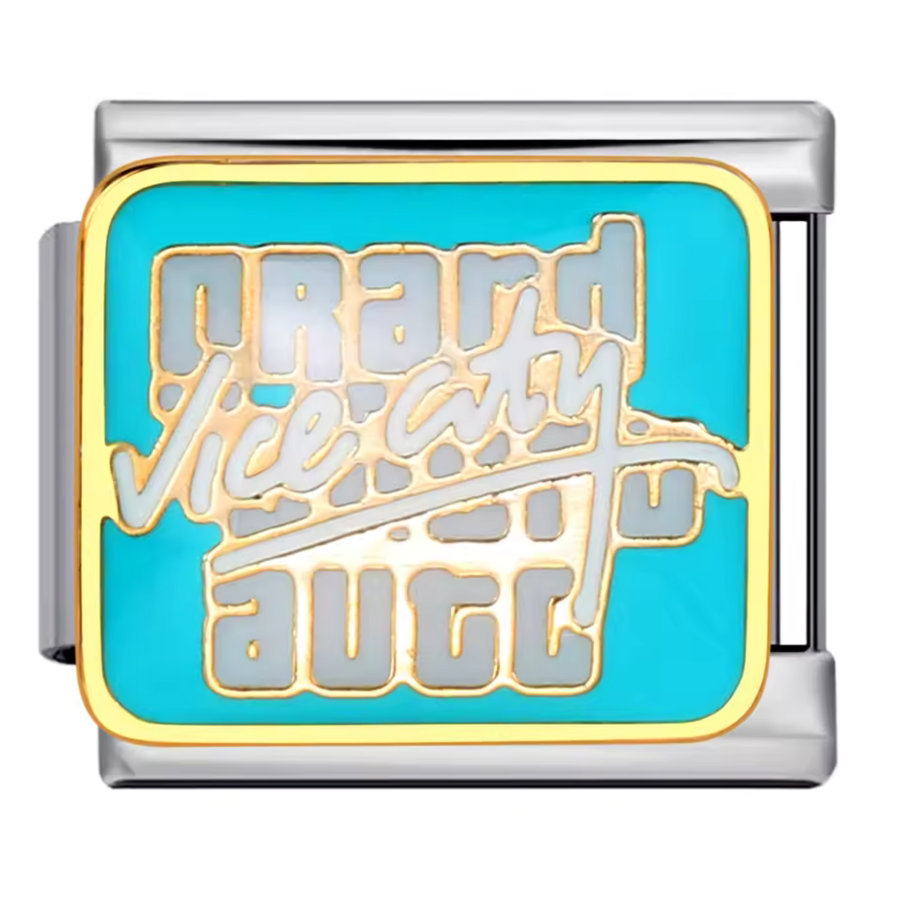 Dieser silberfarbene italienische Charm aus Edelstahl ist eine Hommage an die legendäre Atmosphäre von GTA Vice City. Sein vom berühmten Videospiel inspiriertes Design verleiht Ihrem Armband einen urbanen Retro-Touch – perfekt für Fans der Franchise. Er lässt sich leicht anbringen und passt zu all unseren italienischen Armbändern, die aus 17 dehnbaren und verstellbaren Gliedern bestehen. Dieses einzigartige Schmuckstück ist mit all unseren italienischen Charms kompatibel und wird Gaming- und Vintage-Fans begeistern.