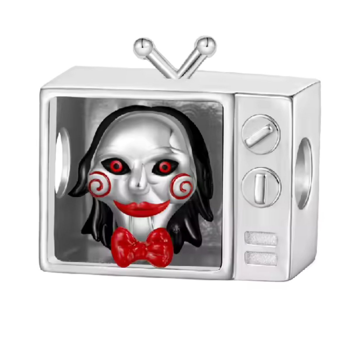 Tauchen Sie mit unserem exklusiven „Saw“-Charm in die Kultwelt des Horrors ein. Dieses fein gearbeitete Schmuckstück stellt die unvergessliche Puppe Billy vor einem Miniaturfernseher dar, eine symbolische Anspielung auf die Saga.