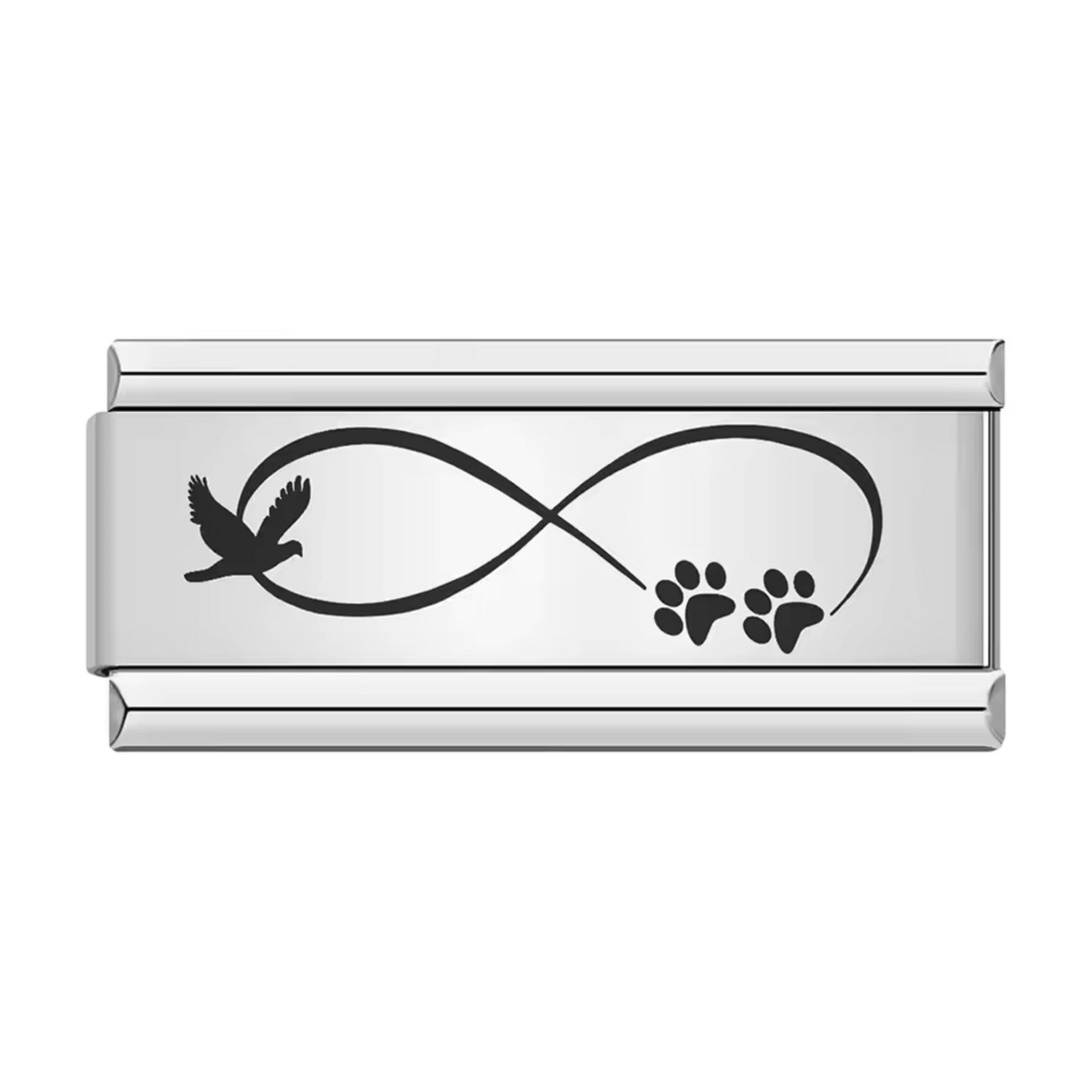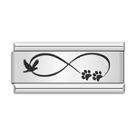 Charm Italien Long Argenté – Signe Infini avec Colombe et Empreintes de Pattes