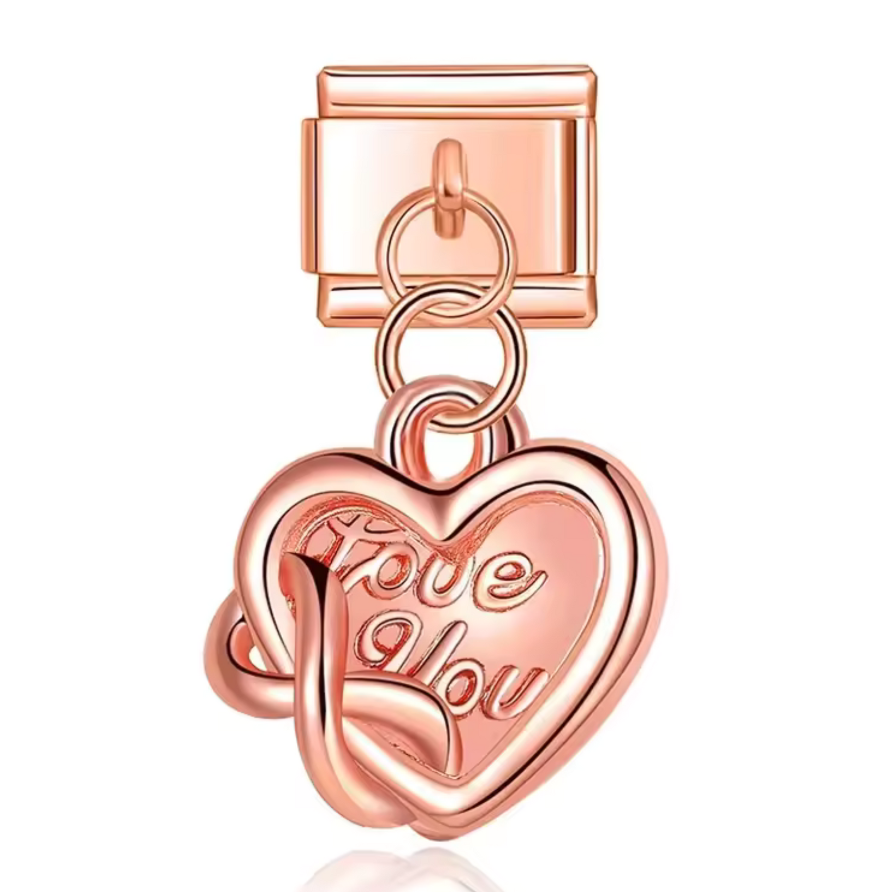 Ce charm italien pendentif en couleur or rose représente un cœur élégant avec l’inscription "Love You" et le symbole de l’infini, parfait pour symboliser un amour éternel. Fabriqué en acier inoxydable de haute qualité, il allie délicatesse et solidité. Sa forme pendentif lui permet d’apporter une touche romantique et raffinée à vos bijoux. Facile à fixer, il s’adapte parfaitement à nos bracelets composés de 17 maillons extensibles et réglables. Compatible avec tous nos charms italiens, ce bijou est idéal pour personnaliser votre bracelet ou collier avec un message tendre et intemporel.