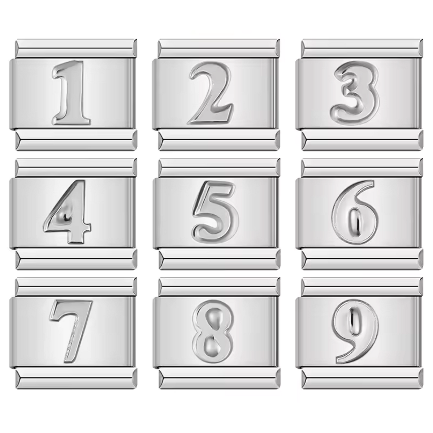 Ces charms italiens argentés représentent les chiffres de 0 à 9, parfaits pour composer des dates, des âges ou des numéros fétiches. Fabriqués en acier inoxydable de haute qualité avec une finition argentée brillante, ils allient robustesse et élégance intemporelle. Faciles à fixer, ils s’adaptent parfaitement à nos bracelets composés de 17 maillons extensibles et réglables, convenant à toutes les tailles de poignet. Compatibles avec tous nos charms italiens, ces bijoux sont idéaux pour personnaliser votre bracelet de manière unique et significative.