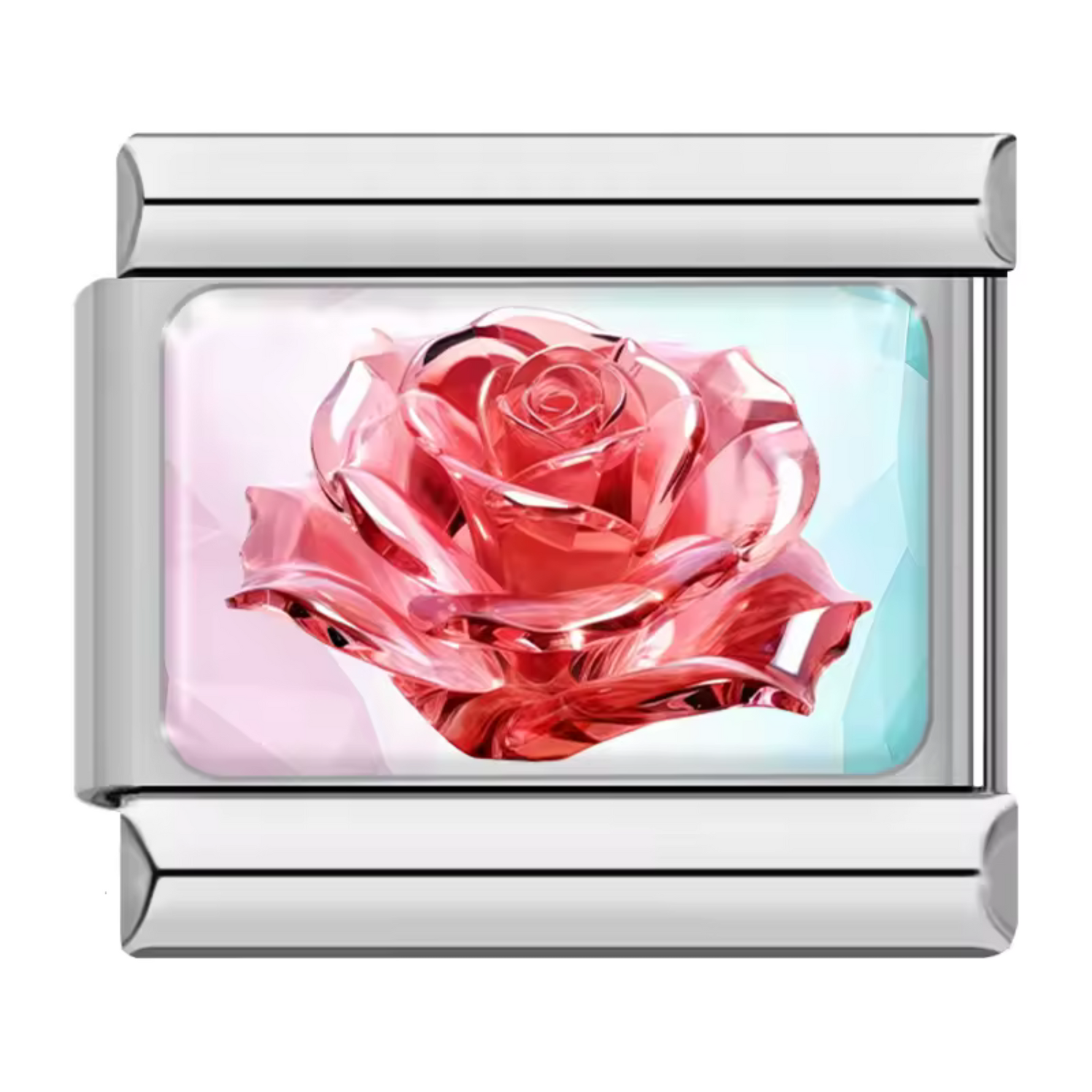 Ce charm italien en acier inoxydable argenté met en valeur une somptueuse rose, aux pétales finement travaillés dans un effet cristal éclatant. Le fond aux teintes pastel rose et bleu ajoute une touche poétique et romantique à ce bijou raffiné. Symbole d’amour et d’élégance, ce charm apportera douceur et lumière à votre bracelet. Facile à intégrer, il s’adapte à nos bracelets composés de 17 maillons extensibles et réglables, pour convenir à tous les poignets. Compatible avec tous nos charms italiens, c’est un choix idéal pour sublimer votre collection avec une note florale lumineuse.