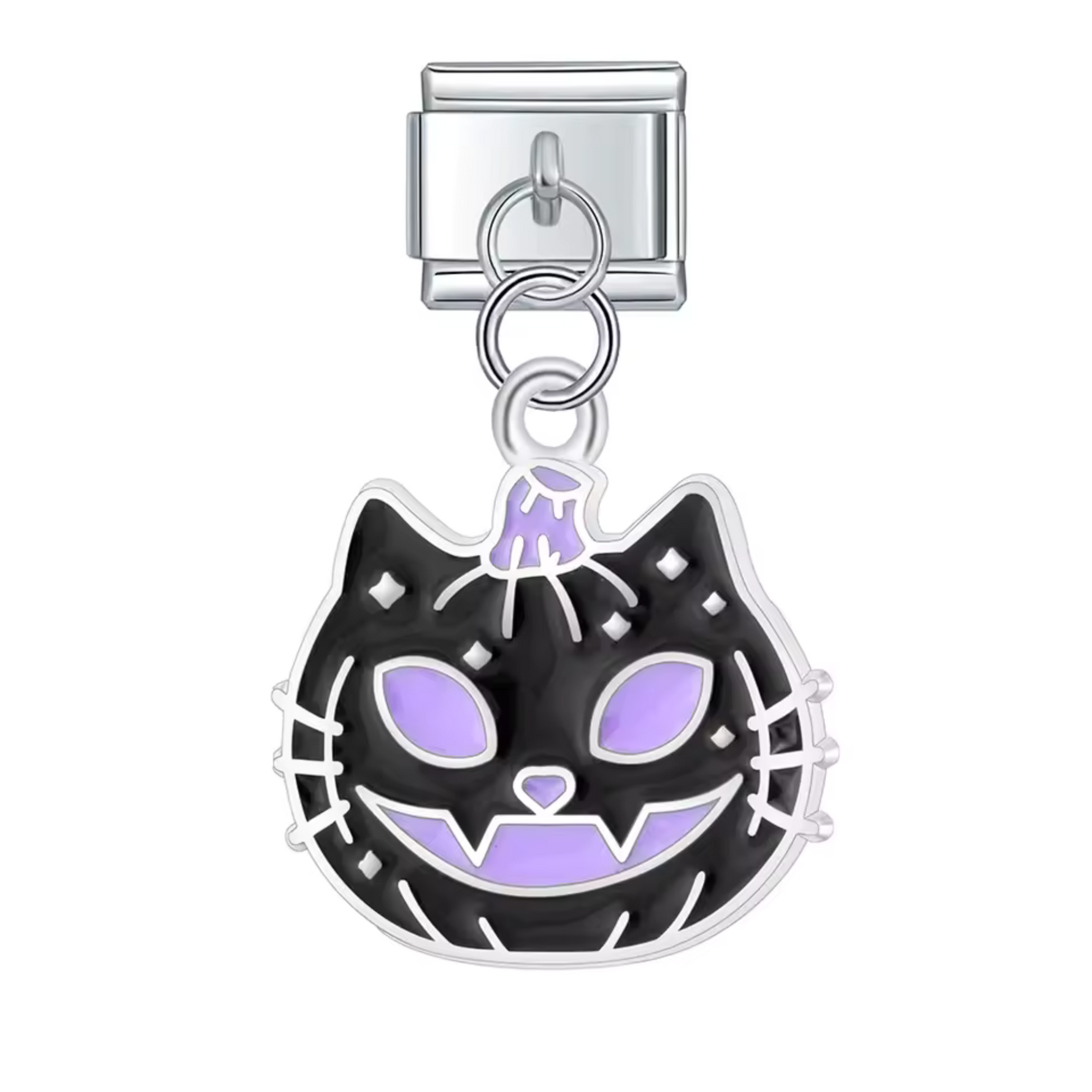 Charm Italien Pendentif Argenté – Chat Citrouille Noir et Violet