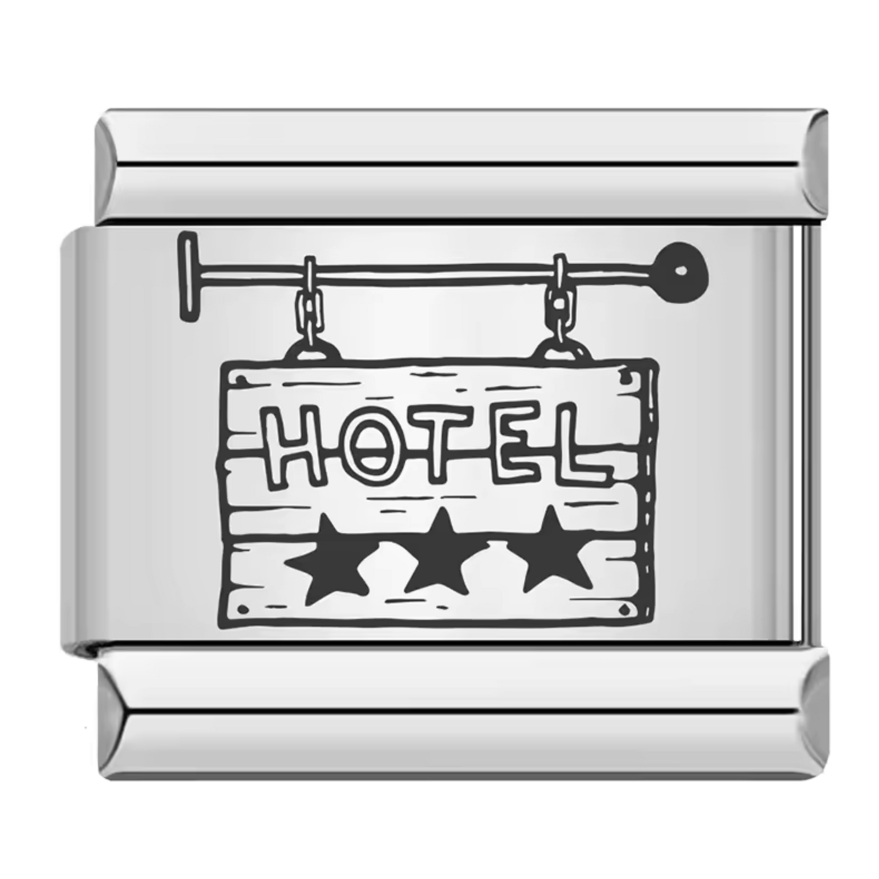 Ce charm italien représente un hôtel 3 étoiles, parfait pour les passionnés de voyages et de séjours inoubliables. Fabriqué en acier inoxydable de haute qualité, il associe robustesse et détails minutieux pour un rendu original et élégant. Facile à fixer, il s’adapte parfaitement à nos bracelets composés de 17 maillons extensibles et réglables, convenant à toutes les tailles de poignet. Compatible avec tous nos charms italiens, ce bijou symbolique est idéal pour personnaliser votre bracelet avec une touche d’évasion et d’aventure.