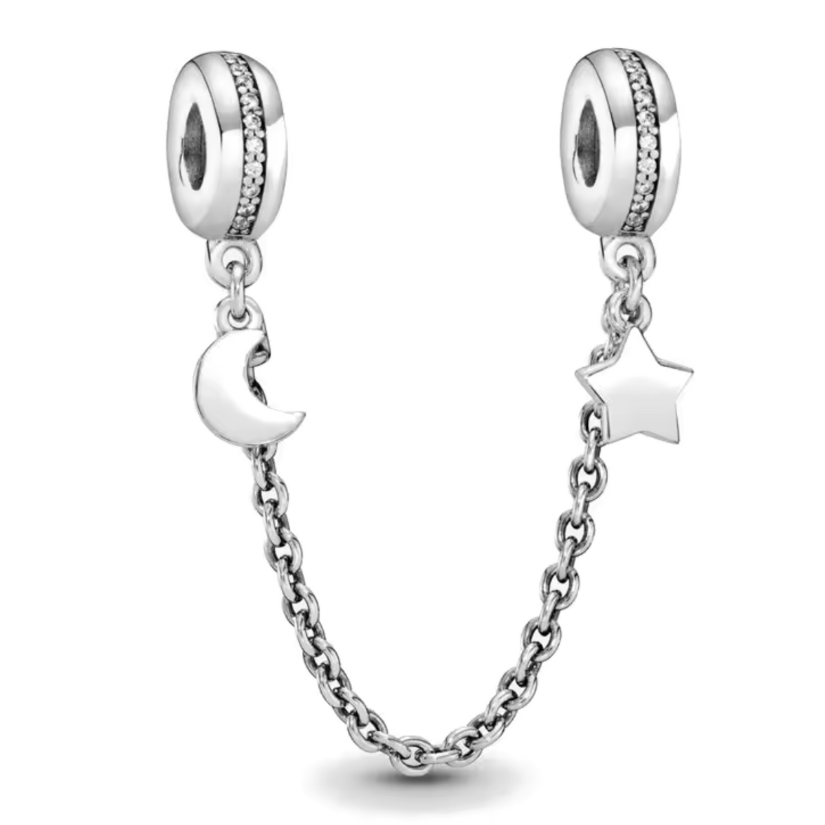 This safety chain, crafted from sterling silver, is delicately adorned with a crescent moon and a sparkling star. A symbol of mystery and guidance, this piece of jewelry protects your bracelet while adding a touch of soft, timeless elegance. A precious accessory that combines safety and dreams at every moment.