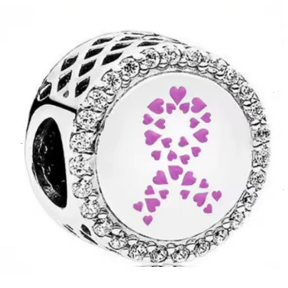 • Design : Round charm with a pink ribbon and small decorative hearts