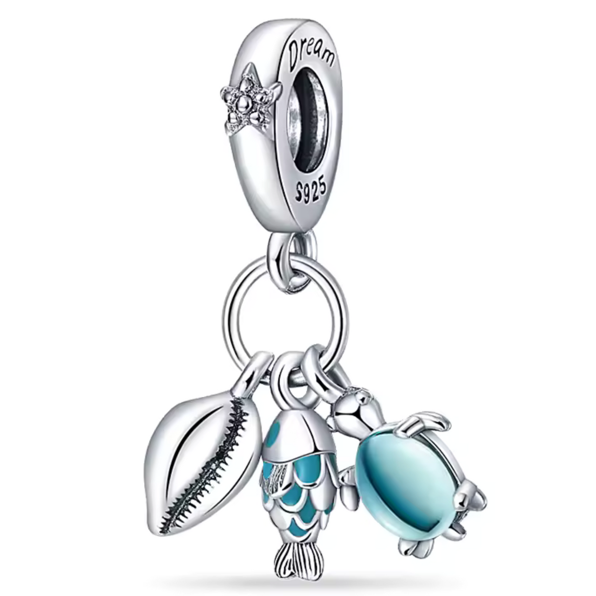 Add an exotic, marine touch to your collection with this unique Blue Ocean charm! Crafted in sterling silver, this charm features a delicately sculpted blue turtle, accompanied by a fish and a shell, capturing the essence of underwater wonders. This detailed and soothing design is perfect for sea lovers and those who dream of paradise beaches.